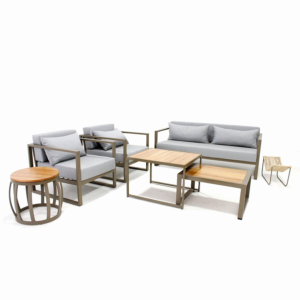 Jogo conjunto de sofá 2 lugares completo com poltronas individuais para área externa e interna todo em alumínio e almofadas com tecido impermeável. Jogo de sofá em módulos muito versátil, pode ser usado em área interna como sala de esta e varandas, pode ser utilizado também em área externa como jardim, piscina e pergolado.