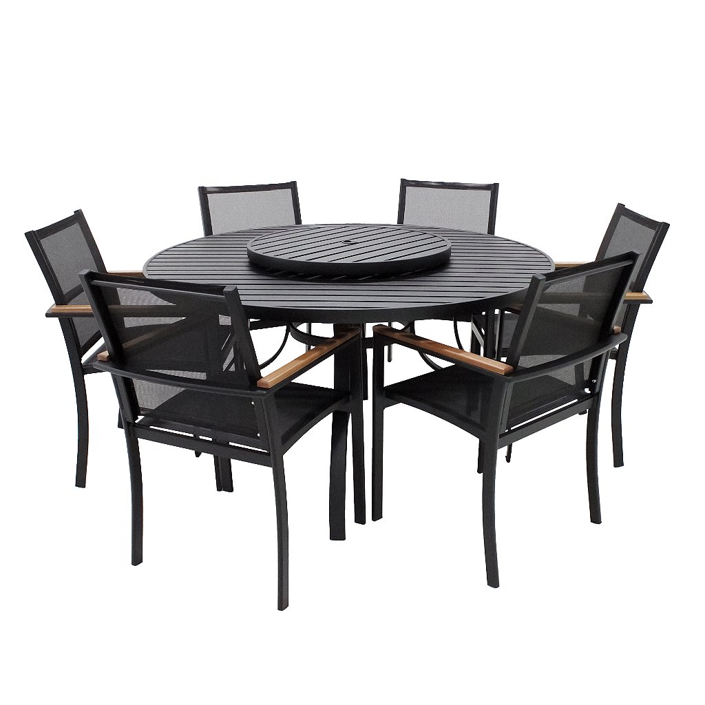 Conjunto de Mesa de Alumínio com Tampo Giratório, 6 Cadeiras e Ombrelone. Pode ser usado em área externa e interna.